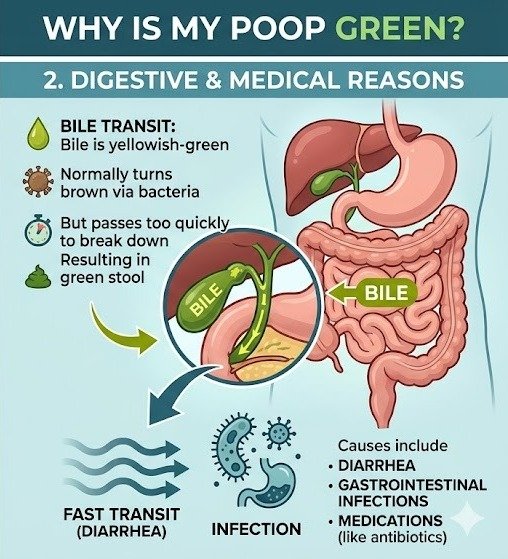 Some bacterial, viral, or parasitic infections can speed up digestion, leading to green stool. Conditions like food poisoning or stomach infections often come with other symptoms such as abdominal pain, vomiting, or diarrhea.